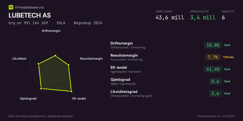 LUBETECH AS,SOLA — jo større areal, jo sterkere økonomi.Org.nr 991 144 269 · Regnskap2024