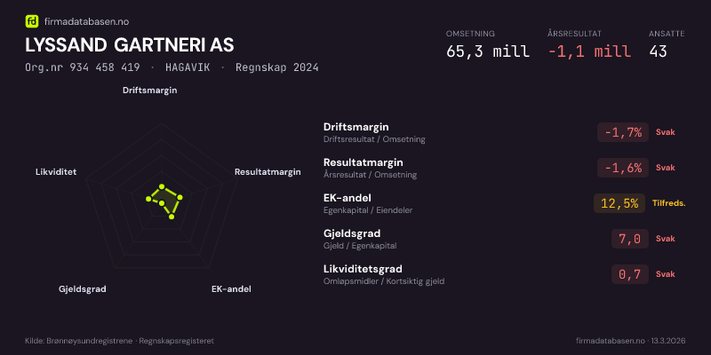 LYSSAND GARTNERI AS,HAGAVIK — jo større areal, jo sterkere økonomi.Org.nr 934 458 419 · Regnskap2024