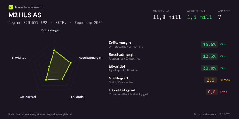 Firmadatabasen.no oppdateres nattlig med nye data fra Brønnøysundregistrene. Endringer i roller, adresse, status og andre registerdata fanges opp automatisk. Du kan følge M2 HUS AS og få varsel på e-post når vi registrerer endringer — klikk «Følg selskap» øverst på denne siden.