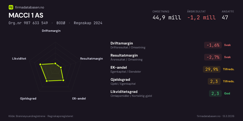 MACCI 1 AS hadde en omsetning på 44,9 MNOK for regnskapsåret 2024 ifølge siste innsendte årsregnskap. Regnskapstallene hentes fra Brønnøysundregistrene.