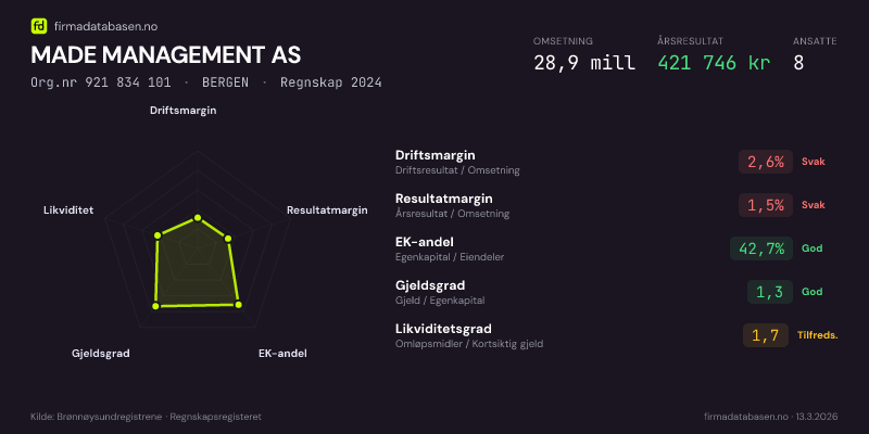 MADE MANAGEMENT AS hadde en omsetning på 28,9 MNOK for regnskapsåret 2024 ifølge siste innsendte årsregnskap. Regnskapstallene hentes fra Brønnøysundregistrene.