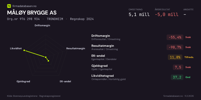 MÅLØY BRYGGE AS hadde en omsetning på 5,1 MNOK for regnskapsåret 2024 ifølge siste innsendte årsregnskap. Regnskapstallene hentes fra Brønnøysundregistrene.