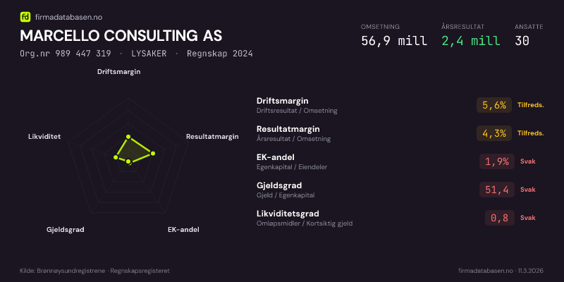 MARCELLO CONSULTING AS hadde en omsetning på 56,9 MNOK for regnskapsåret 2024 ifølge siste innsendte årsregnskap. Regnskapstallene hentes fra Brønnøysundregistrene.