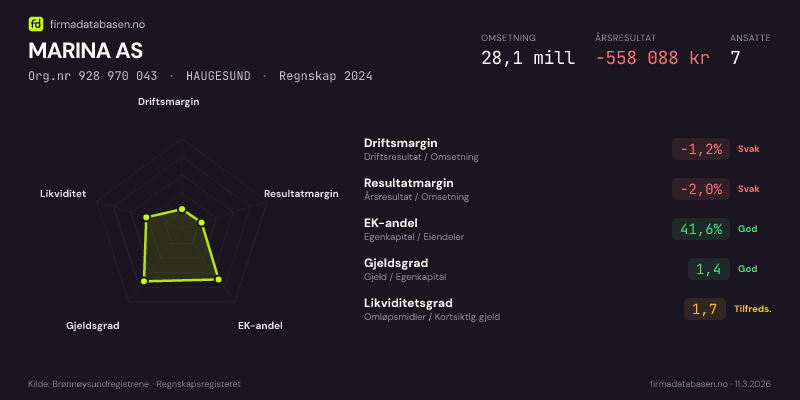 MARINA AS,HAUGESUND — jo større areal, jo sterkere økonomi.Org.nr 928 970 043 · Regnskap2024