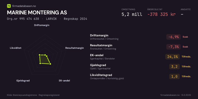 MARINE MONTERING AS,LARVIK — jo større areal, jo sterkere økonomi.Org.nr 995 474 638 · Regnskap2024