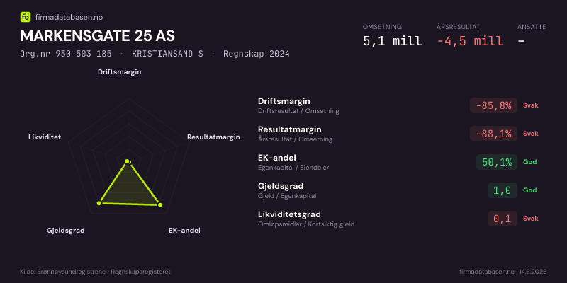 MARKENSGATE 25 AS hadde en omsetning på 5.1 mill i 2024, med driftsmargin på -85.8%.