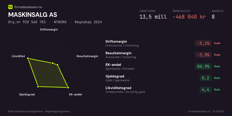 MASKINSALG AS hadde en omsetning på 13,5 MNOK for regnskapsåret 2024 ifølge siste innsendte årsregnskap. Regnskapstallene hentes fra Brønnøysundregistrene.
