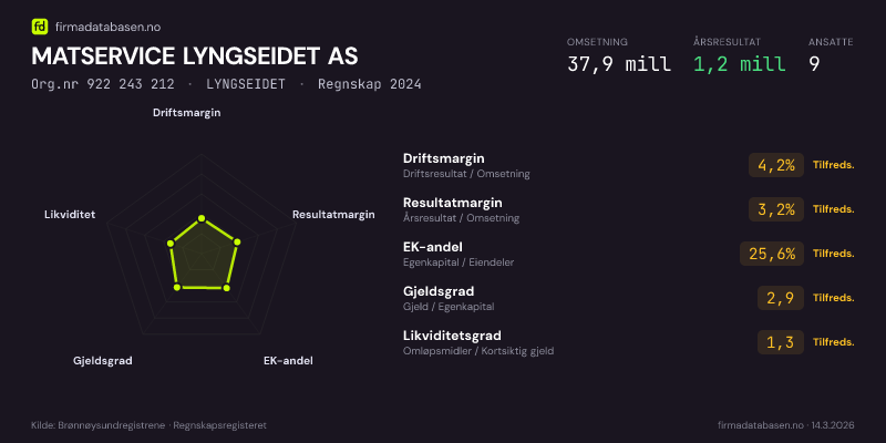MATSERVICE LYNGSEIDET AS hadde en omsetning på 37,9 MNOK for regnskapsåret 2024 ifølge siste innsendte årsregnskap. Regnskapstallene hentes fra Brønnøysundregistrene.