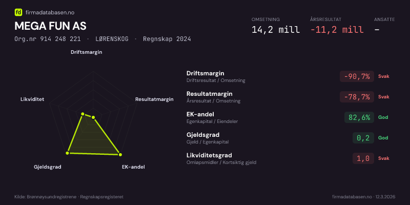 MEGA FUN AS hadde en omsetning på 14,2 MNOK for regnskapsåret 2024 ifølge siste innsendte årsregnskap. Regnskapstallene hentes fra Brønnøysundregistrene.