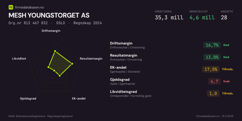 MESH YOUNGSTORGET AS hadde en omsetning på 35,3 MNOK for regnskapsåret 2024 ifølge siste innsendte årsregnskap. Regnskapstallene hentes fra Brønnøysundregistrene.