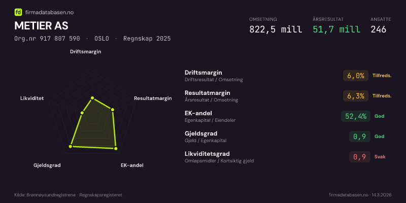 METIER AS hadde en omsetning på 822,5 MNOK for regnskapsåret 2025 ifølge siste innsendte årsregnskap. Regnskapstallene hentes fra Brønnøysundregistrene.