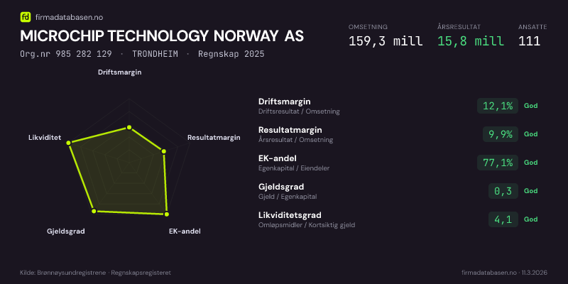 MICROCHIP TECHNOLOGY NORWAY AS hadde en omsetning på 159.3 mill i 2025, med driftsmargin på 12.1%.