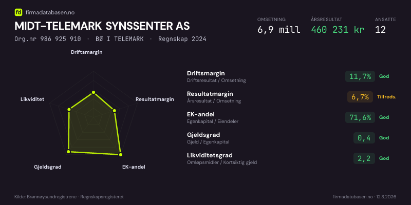MIDT-TELEMARK SYNSSENTER AS,BØ I TELEMARK — jo større areal, jo sterkere økonomi.Org.nr 986 925 910 · Regnskap2024