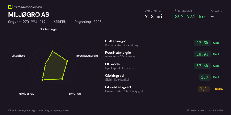 MILJØGRO AS hadde en omsetning på 7,8 MNOK for regnskapsåret 2025 ifølge siste innsendte årsregnskap. Regnskapstallene hentes fra Brønnøysundregistrene.