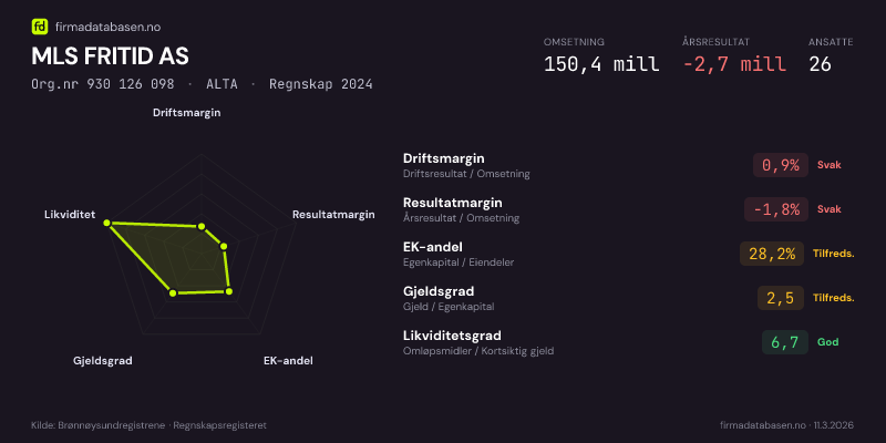 MLS FRITID AS,ALTA — jo større areal, jo sterkere økonomi.Org.nr 930 126 098 · Regnskap2024