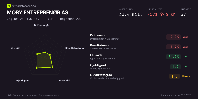 MOBY ENTREPRENØR AS hadde en omsetning på 33,4 MNOK for regnskapsåret 2024 ifølge siste innsendte årsregnskap. Regnskapstallene hentes fra Brønnøysundregistrene.