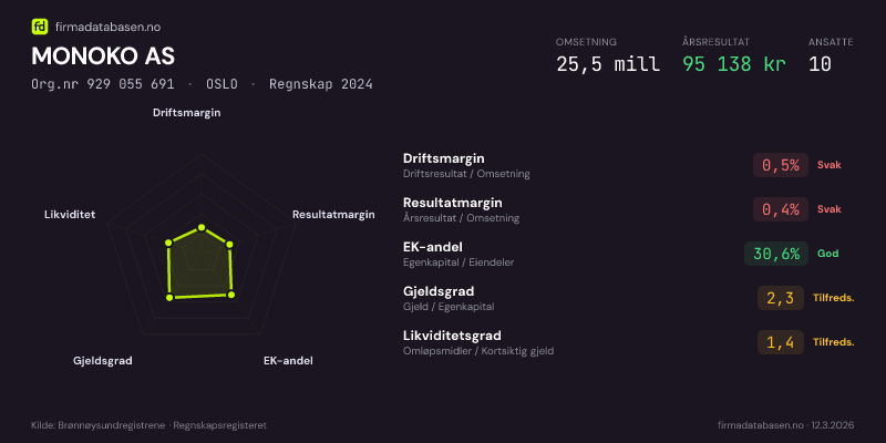 MONOKO AS hadde en omsetning på 25,5 MNOK for regnskapsåret 2024 ifølge siste innsendte årsregnskap. Regnskapstallene hentes fra Brønnøysundregistrene.