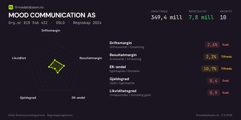MOOD COMMUNICATION AS hadde en omsetning på 349.4 mill i 2024, med driftsmargin på 2.6%.