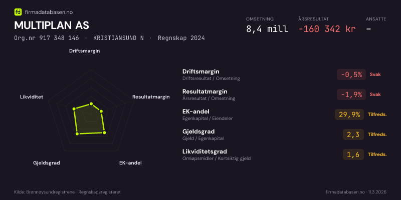 MULTIPLAN AS hadde en omsetning på 8,4 MNOK for regnskapsåret 2024 ifølge siste innsendte årsregnskap. Regnskapstallene hentes fra Brønnøysundregistrene.