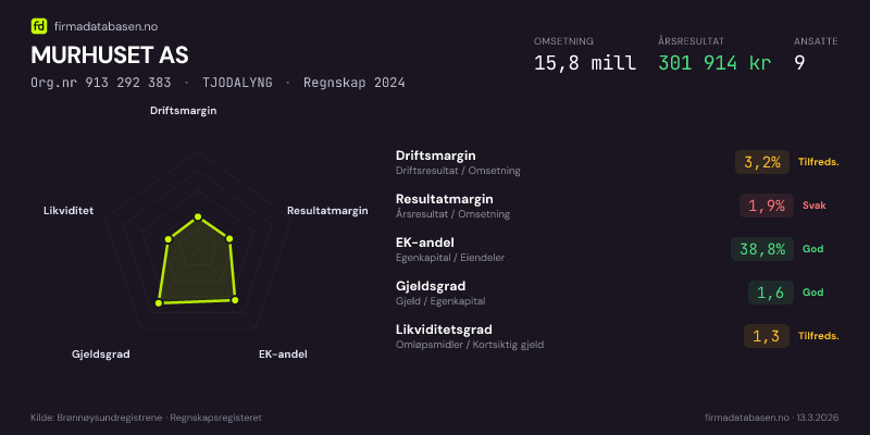MURHUSET AS hadde en omsetning på 15,8 MNOK for regnskapsåret 2024 ifølge siste innsendte årsregnskap. Regnskapstallene hentes fra Brønnøysundregistrene.