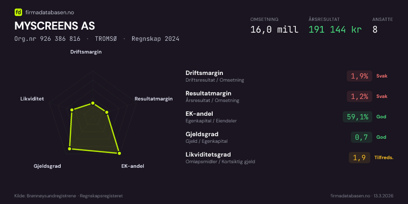 MYSCREENS AS,TROMSØ — jo større areal, jo sterkere økonomi.Org.nr 926 386 816 · Regnskap2024