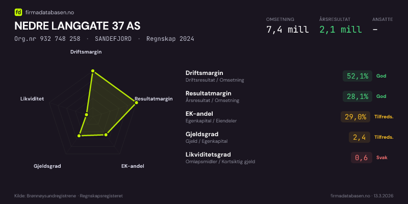 NEDRE LANGGATE 37 AS,SANDEFJORD — jo større areal, jo sterkere økonomi.Org.nr 932 748 258 · Regnskap2024