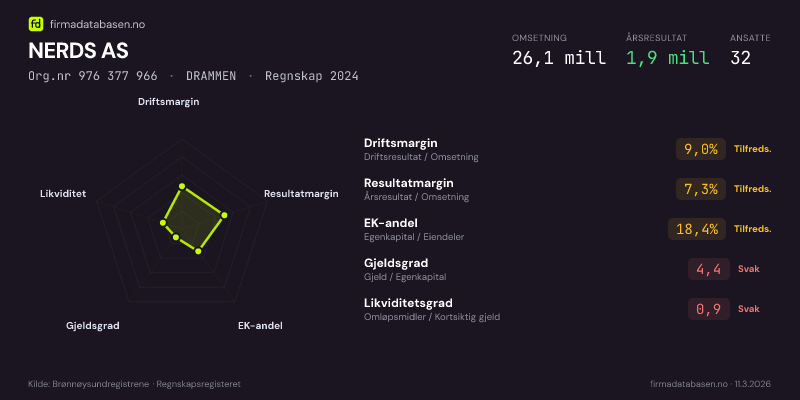 NERDS AS hadde en omsetning på 26.1 mill i 2024, med driftsmargin på 9.0%.