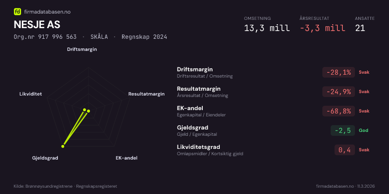 Firmadatabasen.no oppdateres nattlig med nye data fra Brønnøysundregistrene. Endringer i roller, adresse, status og andre registerdata fanges opp automatisk. Du kan følge NESJE AS og få varsel på e-post når vi registrerer endringer — klikk «Følg selskap» øverst på denne siden.
