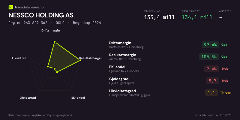 NESSCO HOLDING AS hadde en omsetning på 133,4 MNOK for regnskapsåret 2024 ifølge siste innsendte årsregnskap. Regnskapstallene hentes fra Brønnøysundregistrene.