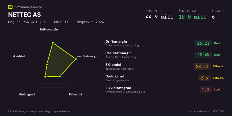 NETTEC AS,KOLBOTN — jo større areal, jo sterkere økonomi.Org.nr 936 361 285 · Regnskap2024