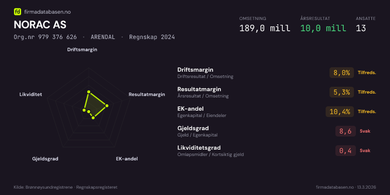 NORAC AS hadde en omsetning på 189.0 mill i 2024, med driftsmargin på 8.0%.