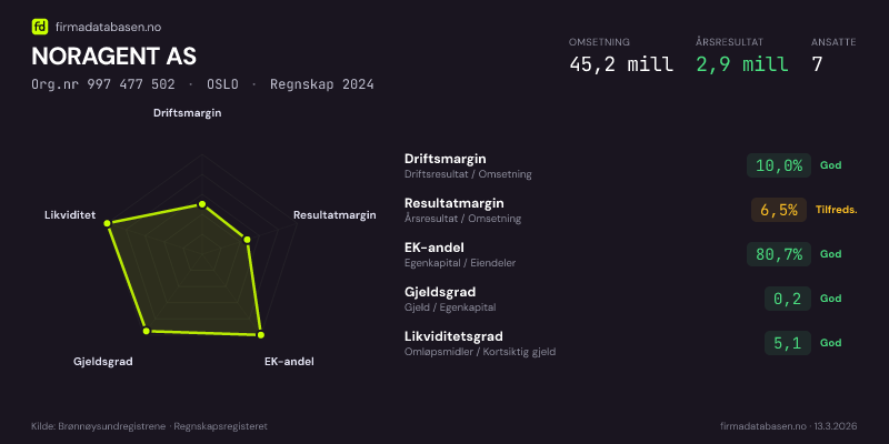 NORAGENT AS hadde en omsetning på 45,2 MNOK for regnskapsåret 2024 ifølge siste innsendte årsregnskap. Regnskapstallene hentes fra Brønnøysundregistrene.