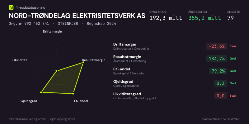 NORD-TRØNDELAG ELEKTRISITETSVERK AS hadde en omsetning på 192,3 MNOK for regnskapsåret 2024 ifølge siste innsendte årsregnskap. Regnskapstallene hentes fra Brønnøysundregistrene.