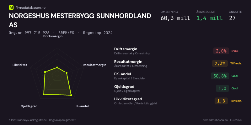 NORGESHUS MESTERBYGG SUNNHORDLAND AS,BREMNES — jo større areal, jo sterkere økonomi.Org.nr 997 715 926 · Regnskap2024
