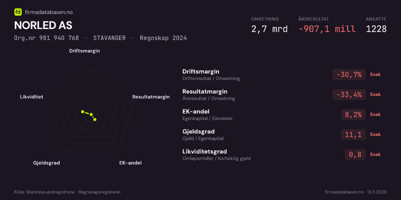NORLED AS hadde en omsetning på 2.7 mrd i 2024, med driftsmargin på -30.7%.