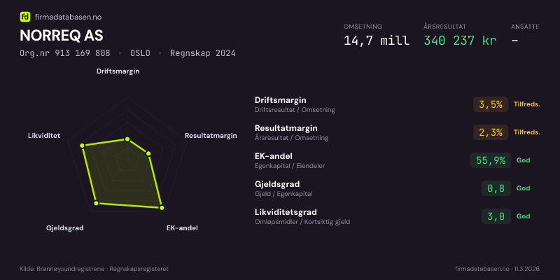 NORREQ AS hadde en omsetning på 14,7 MNOK for regnskapsåret 2024 ifølge siste innsendte årsregnskap. Regnskapstallene hentes fra Brønnøysundregistrene.