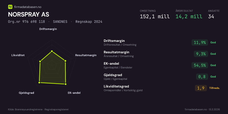 NORSPRAY AS hadde en omsetning på 152.1 mill i 2024, med driftsmargin på 11.9%.