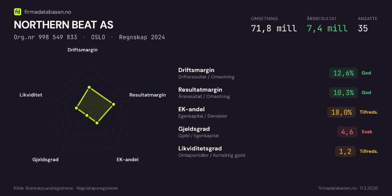 NORTHERN BEAT AS hadde en omsetning på 71,8 MNOK for regnskapsåret 2024 ifølge siste innsendte årsregnskap. Regnskapstallene hentes fra Brønnøysundregistrene.