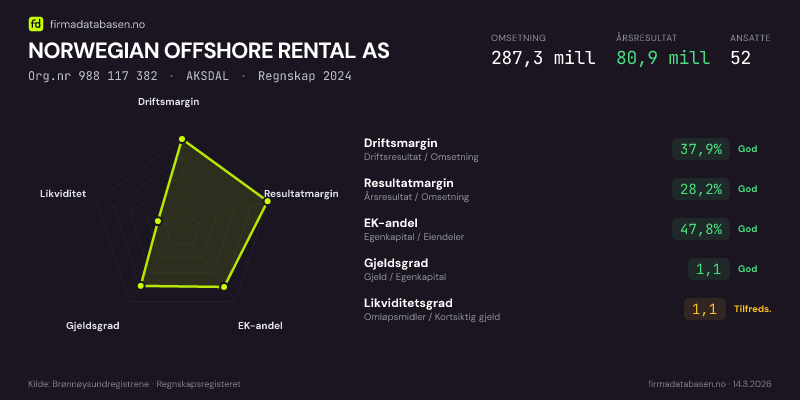 NORWEGIAN OFFSHORE RENTAL AS hadde en omsetning på 287,3 MNOK for regnskapsåret 2024 ifølge siste innsendte årsregnskap. Regnskapstallene hentes fra Brønnøysundregistrene.