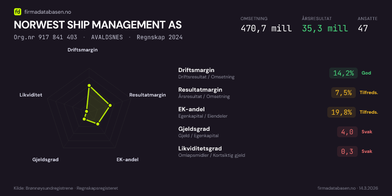 NORWEST SHIP MANAGEMENT AS hadde en omsetning på 470,7 MNOK for regnskapsåret 2024 ifølge siste innsendte årsregnskap. Regnskapstallene hentes fra Brønnøysundregistrene.