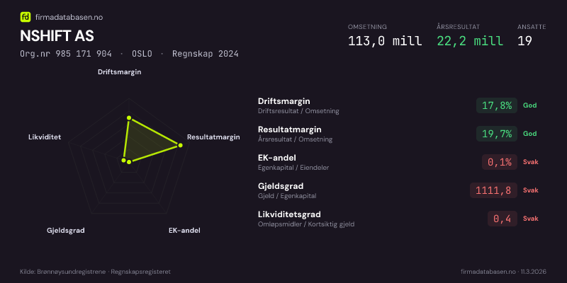 NSHIFT AS hadde en omsetning på 113,0 MNOK for regnskapsåret 2024 ifølge siste innsendte årsregnskap. Regnskapstallene hentes fra Brønnøysundregistrene.