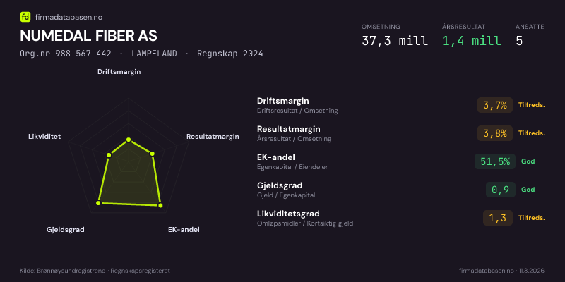 NUMEDAL FIBER AS hadde en omsetning på 37,3 MNOK for regnskapsåret 2024 ifølge siste innsendte årsregnskap. Regnskapstallene hentes fra Brønnøysundregistrene.