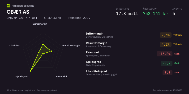 OBÆR AS hadde en omsetning på 17,8 MNOK for regnskapsåret 2024 ifølge siste innsendte årsregnskap. Regnskapstallene hentes fra Brønnøysundregistrene.