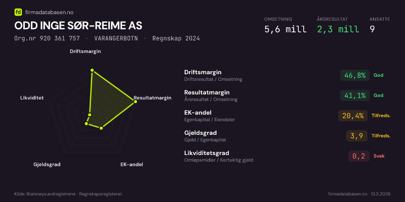 ODD INGE SØR-REIME AS,VARANGERBOTN — jo større areal, jo sterkere økonomi.Org.nr 920 361 757 · Regnskap2024