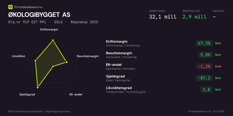 ØKOLOGIBYGGET AS hadde en omsetning på 32,1 MNOK for regnskapsåret 2025 ifølge siste innsendte årsregnskap. Regnskapstallene hentes fra Brønnøysundregistrene.