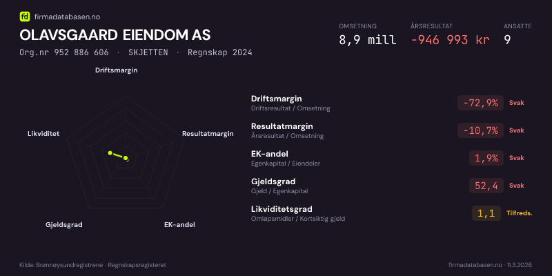 OLAVSGAARD EIENDOM AS hadde en omsetning på 8,9 MNOK for regnskapsåret 2024 ifølge siste innsendte årsregnskap. Regnskapstallene hentes fra Brønnøysundregistrene.