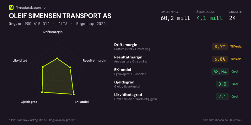 OLEIF SIMENSEN TRANSPORT AS,ALTA — jo større areal, jo sterkere økonomi.Org.nr 980 615 014 · Regnskap2024