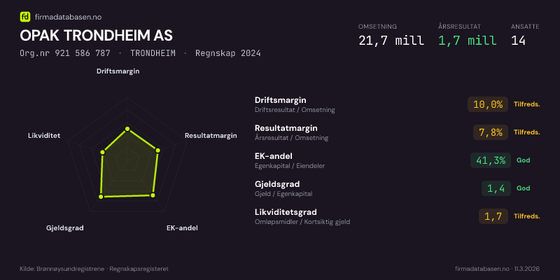 OPAK TRONDHEIM AS hadde en omsetning på 21,7 MNOK for regnskapsåret 2024 ifølge siste innsendte årsregnskap. Regnskapstallene hentes fra Brønnøysundregistrene.