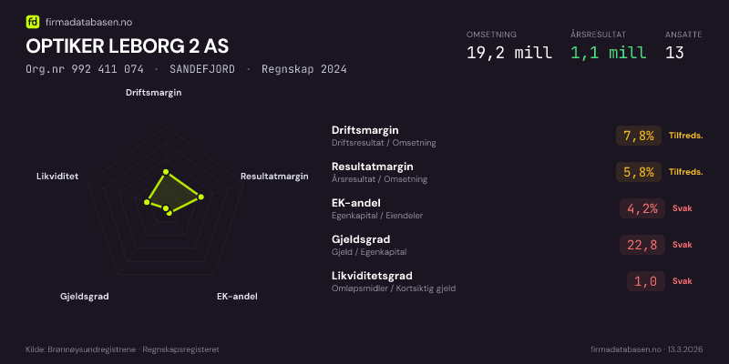 OPTIKER LEBORG 2 AS hadde en omsetning på 19,2 MNOK for regnskapsåret 2024 ifølge siste innsendte årsregnskap. Regnskapstallene hentes fra Brønnøysundregistrene.