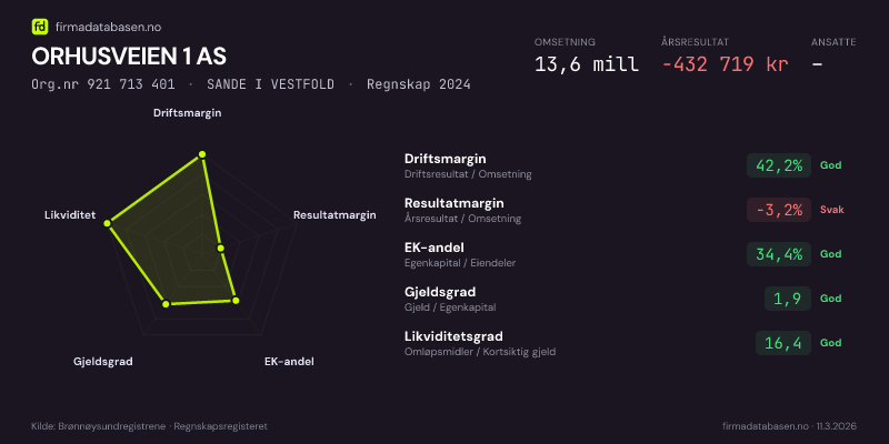 ORHUSVEIEN 1 AS,SANDE I VESTFOLD — jo større areal, jo sterkere økonomi.Org.nr 921 713 401 · Regnskap2024